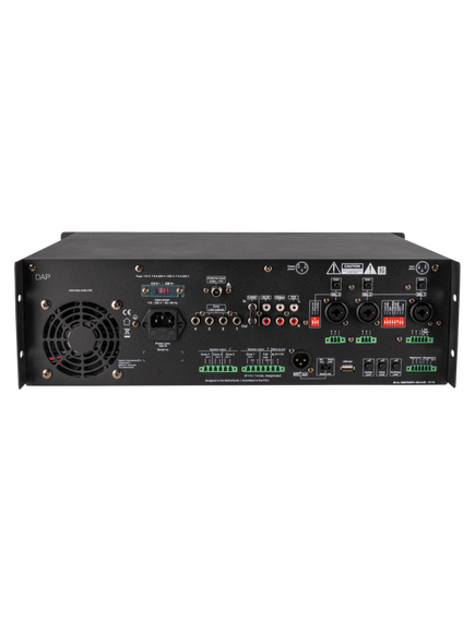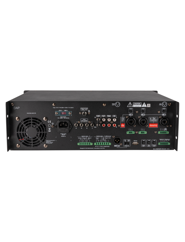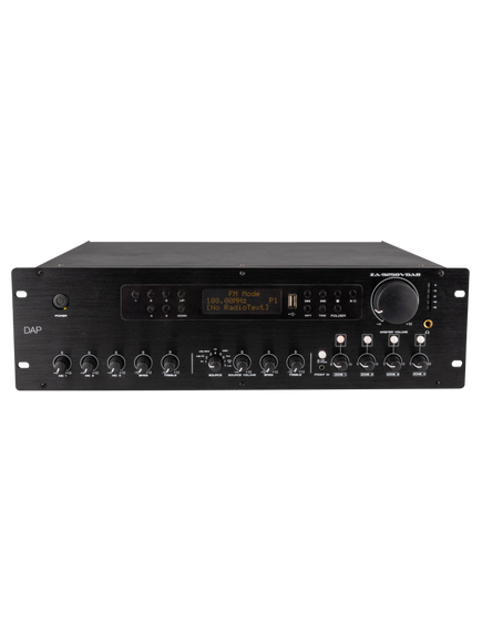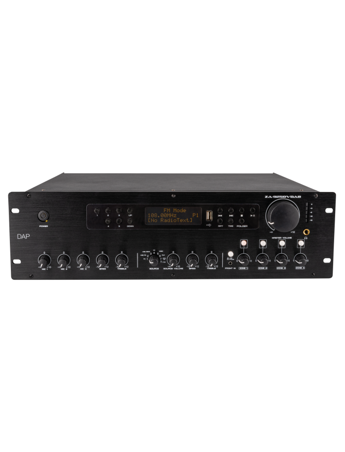The DAP ZA-9250VDAB is a 250-watt 100 V 4-zone mixer amplifier and media player with zone volume control. The 3 microphone/line inputs are equipped with +48 V phantom power and you have a choice of 7 audio sources, including a built-in USB player with two USB inputs (front and rear) and FM/DAB+ tuner with which you can store up to 10 audio stations.