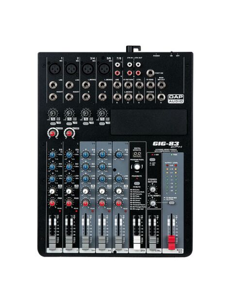The GIG-83 CFX Mixing Console is packed with features that cannot be found in other consoles of it's size: 4 mono (provided with ultra low noise microphone pre amplifiers and Phantom Power at +48 Volt ) and 3 stereo input channels. Each of them are provided with a 3-band equalizer for HI, MID and LOW controls, as well as 1 auxiliary control, built-in 24-bit DSP effect with 100 presets, highly accurate 8-segment bar graph meters and 2-track inputs assignable to main mix, control room/phones or group outputs.